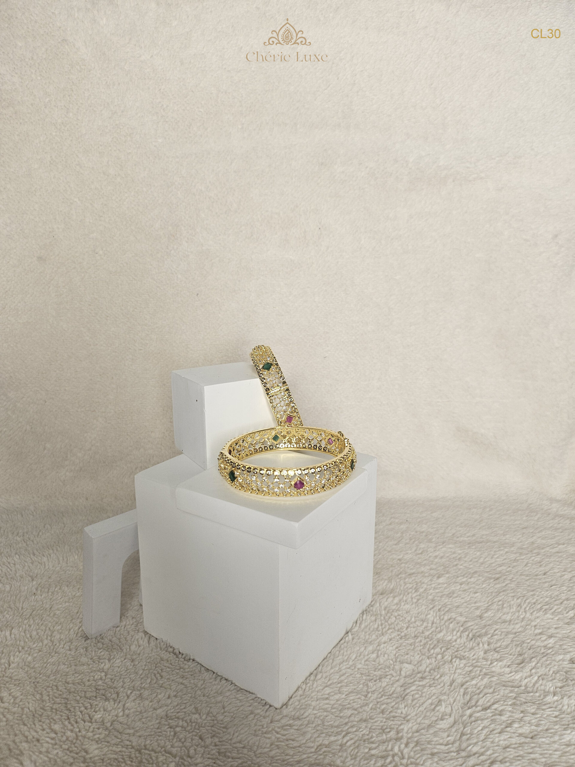 Care Instructions: To maintain the pristine shine of your CherieLuxe bangles, always keep them away from perfumes, water, sprays, and harsh chemicals. Store them safely in a bangle box or a soft pouch after use to protect the intricate stone settings.