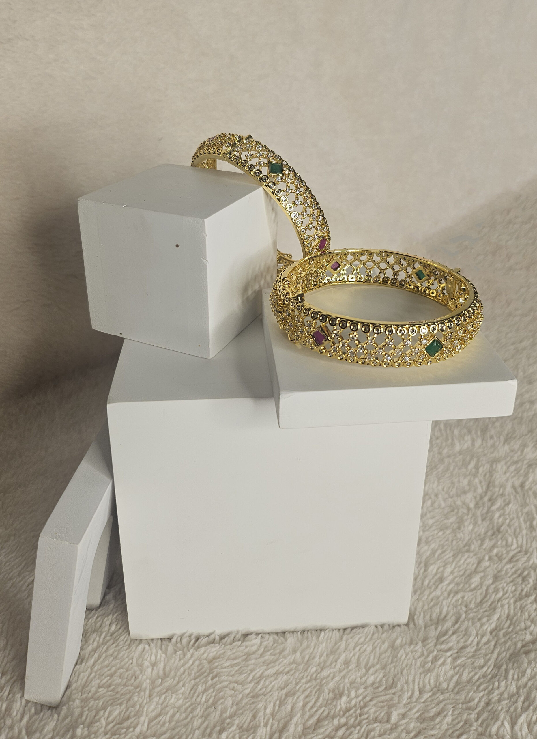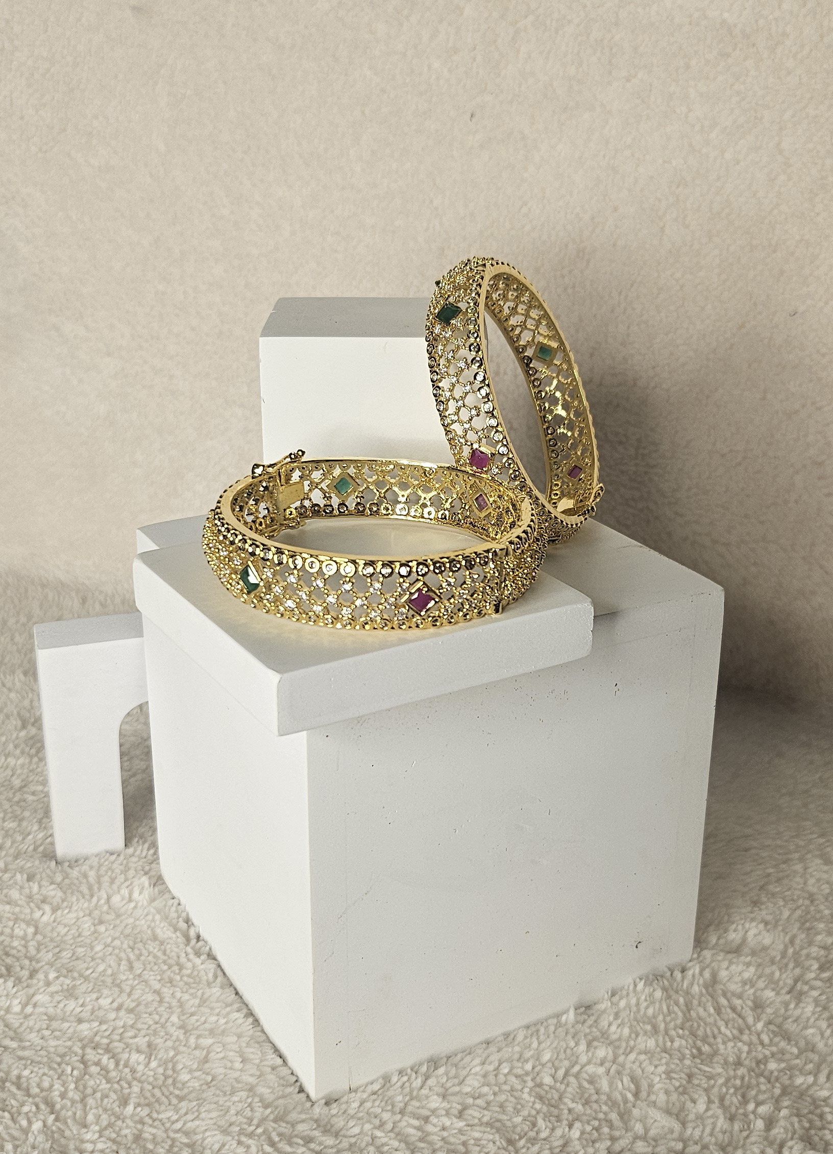 A Masterpiece of Precision and Glamour Designed for the woman who loves bold, traditional elegance with a modern twist, these Openable Gold-Plated Bangles are a must-have for your ethnic wardrobe. Each bangles features a luxurious, wide band showcasing intricate filigree cut-out work, meticulously paved with brilliant clear American Diamonds that catch the light from every angle.