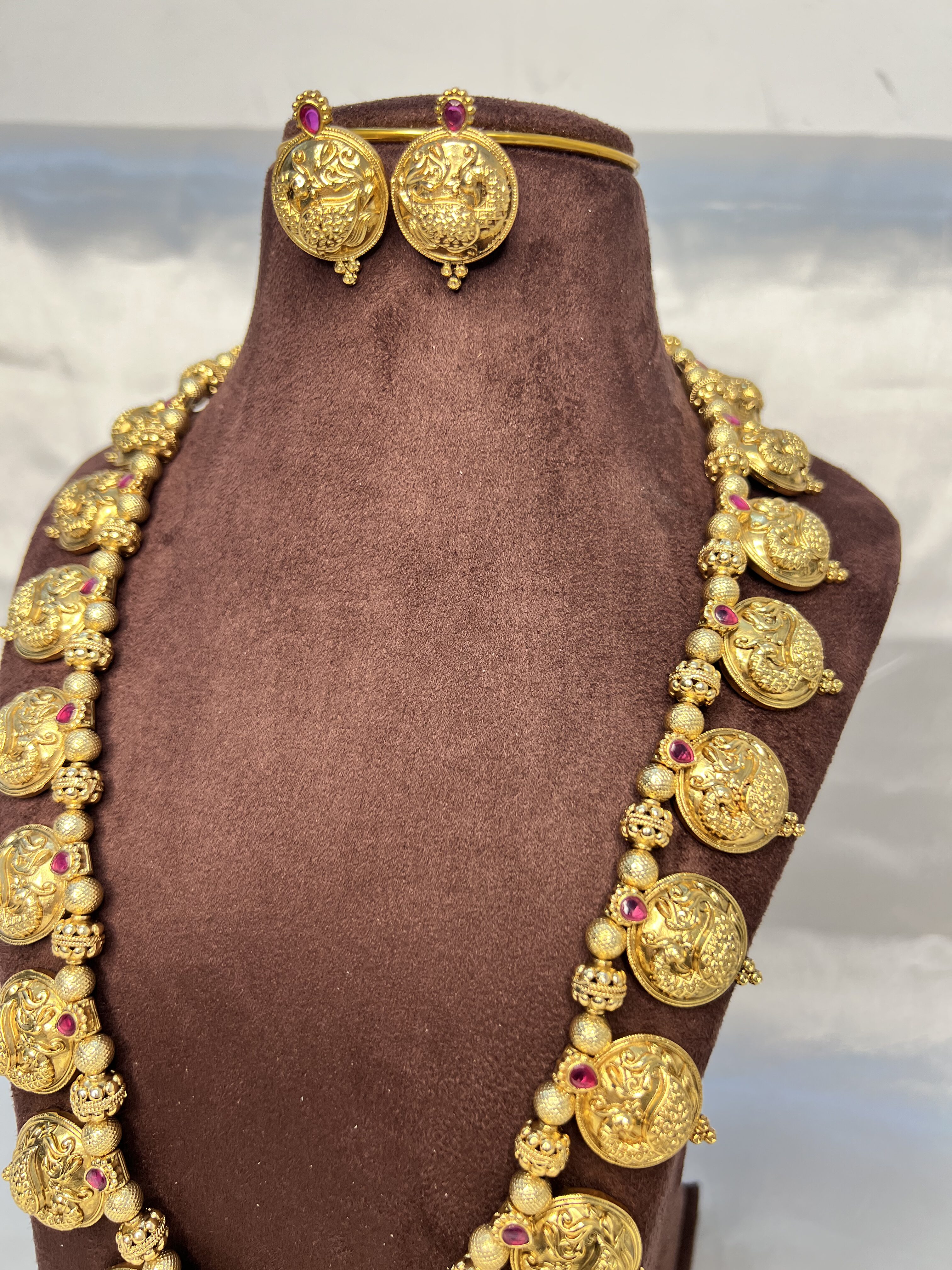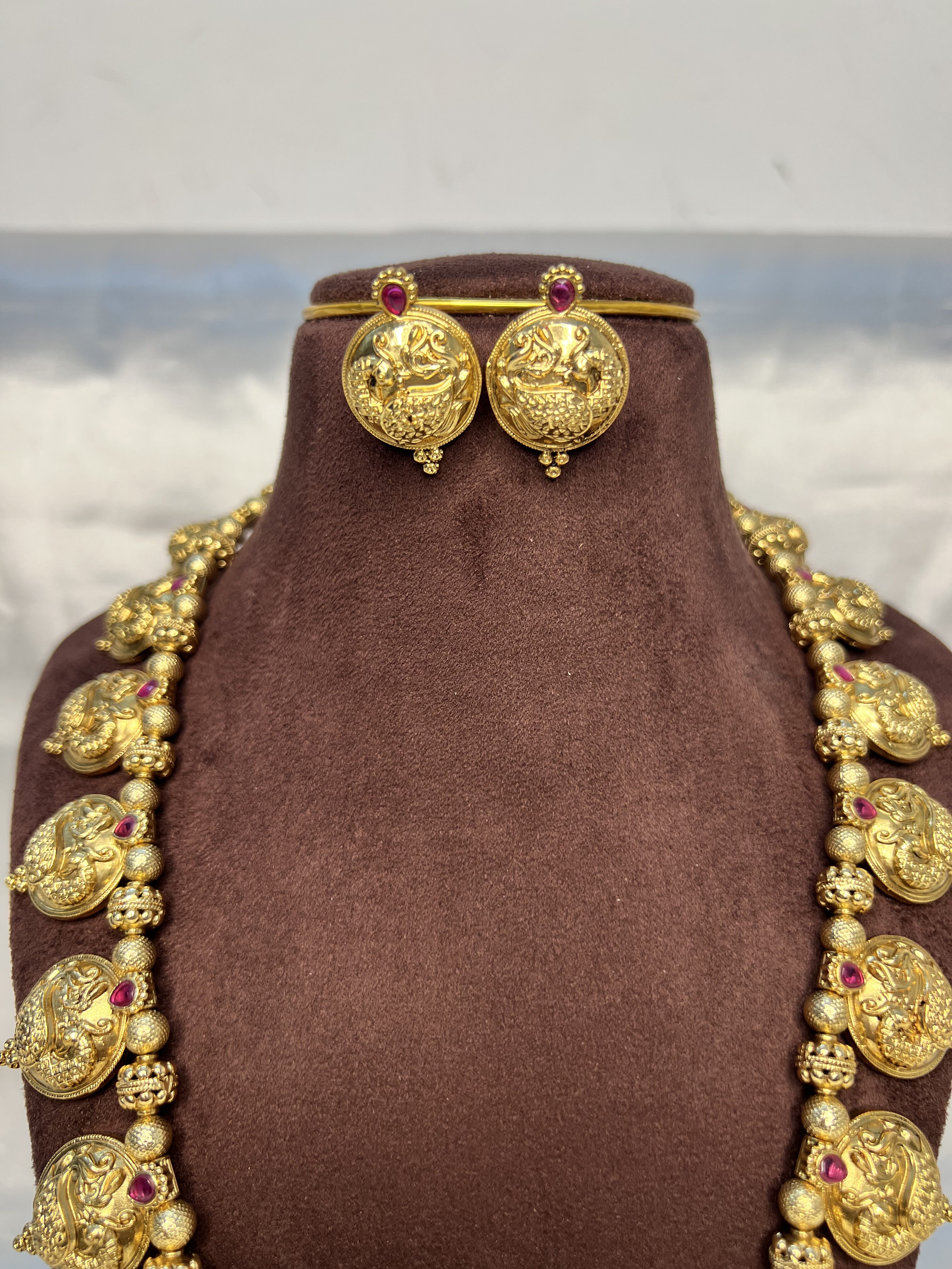 Timeless Appeal: The deep antique finish and ruby-toned accents ensure this set pairs beautifully with rich Kanjivaram silks, vibrant Banarasi sarees, and opulent ethnic wear.