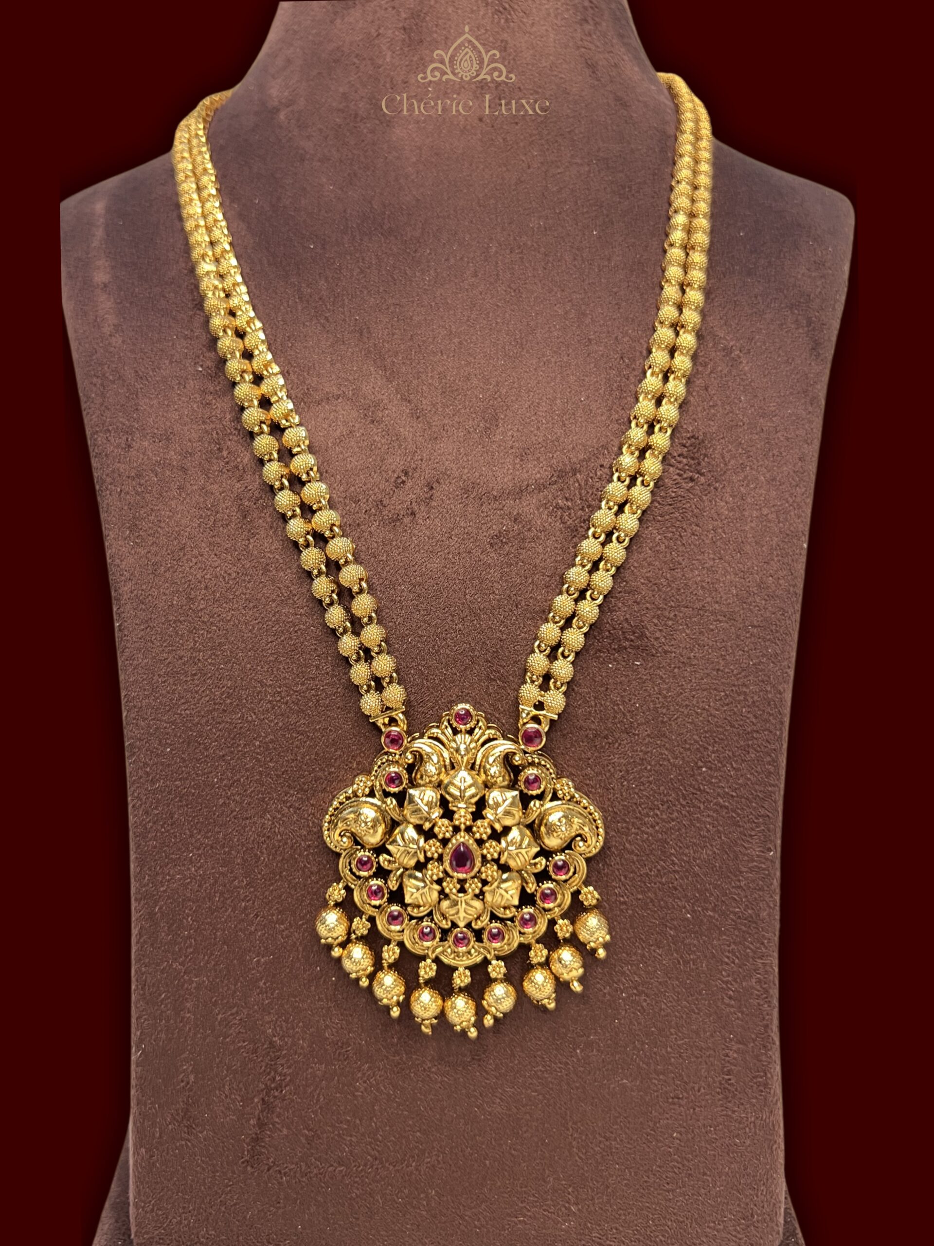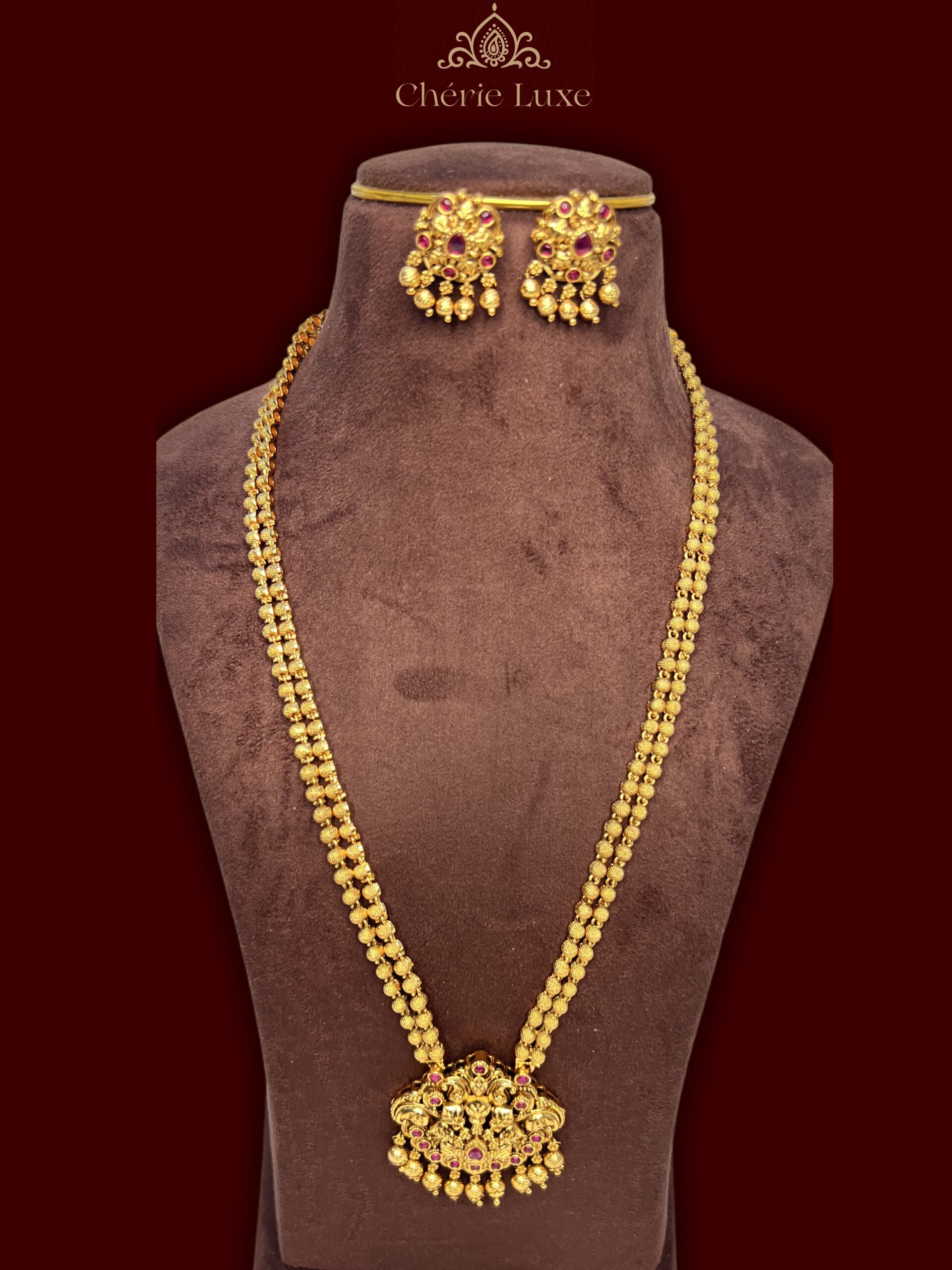 The long, double-layered necklace is meticulously crafted with a continuous sequence of beautifully textured golden beads that drape elegantly down the neckline. The true focal point is a magnificent, intricately detailed statement pendant adorned with classic temple motifs. To complete the opulent design, the pendant and accompanying earrings are accented with delicate ruby-toned stones and finished with traditional golden drop clusters, all beautifully finished in a premium antique gold-plated setting.