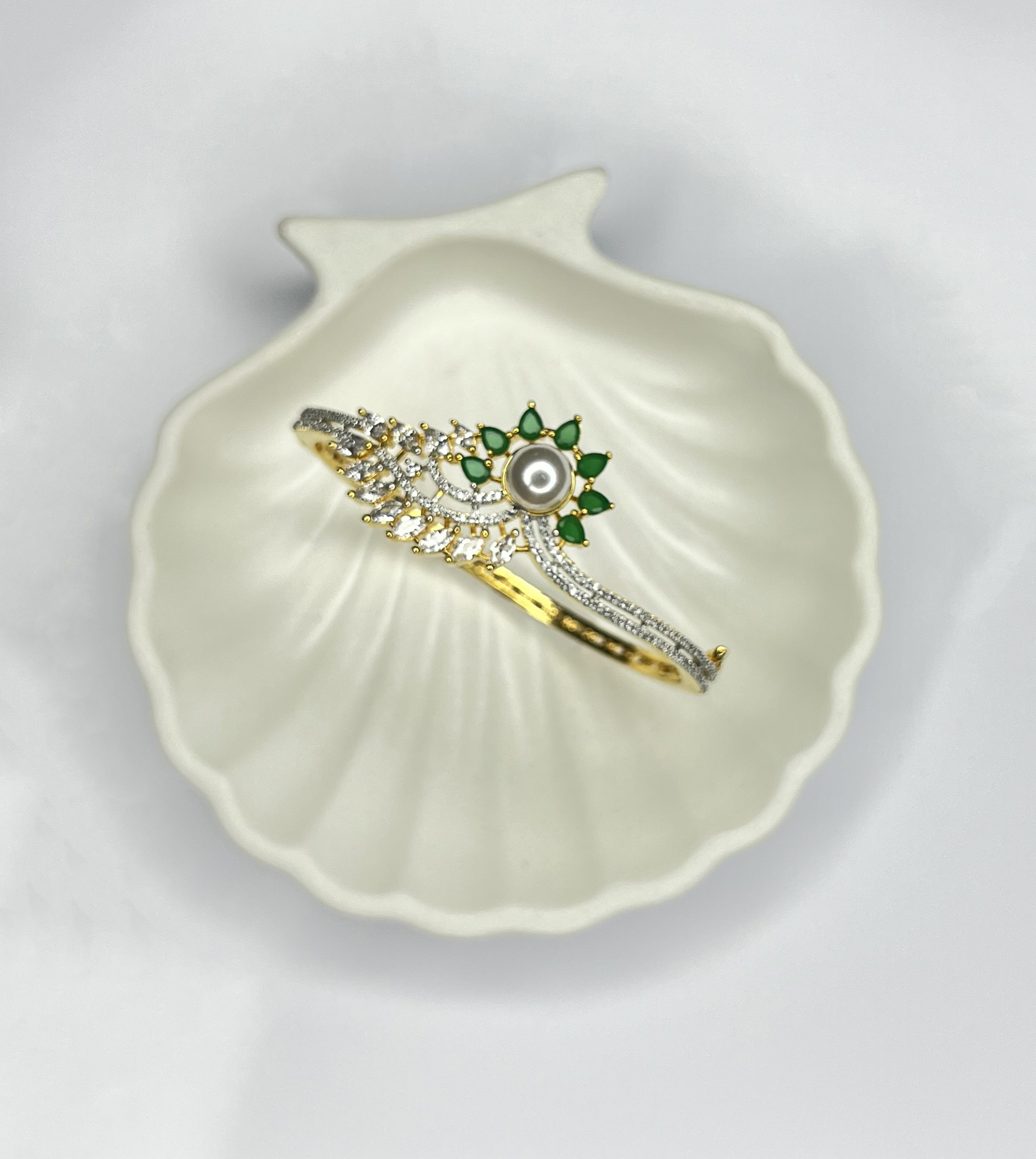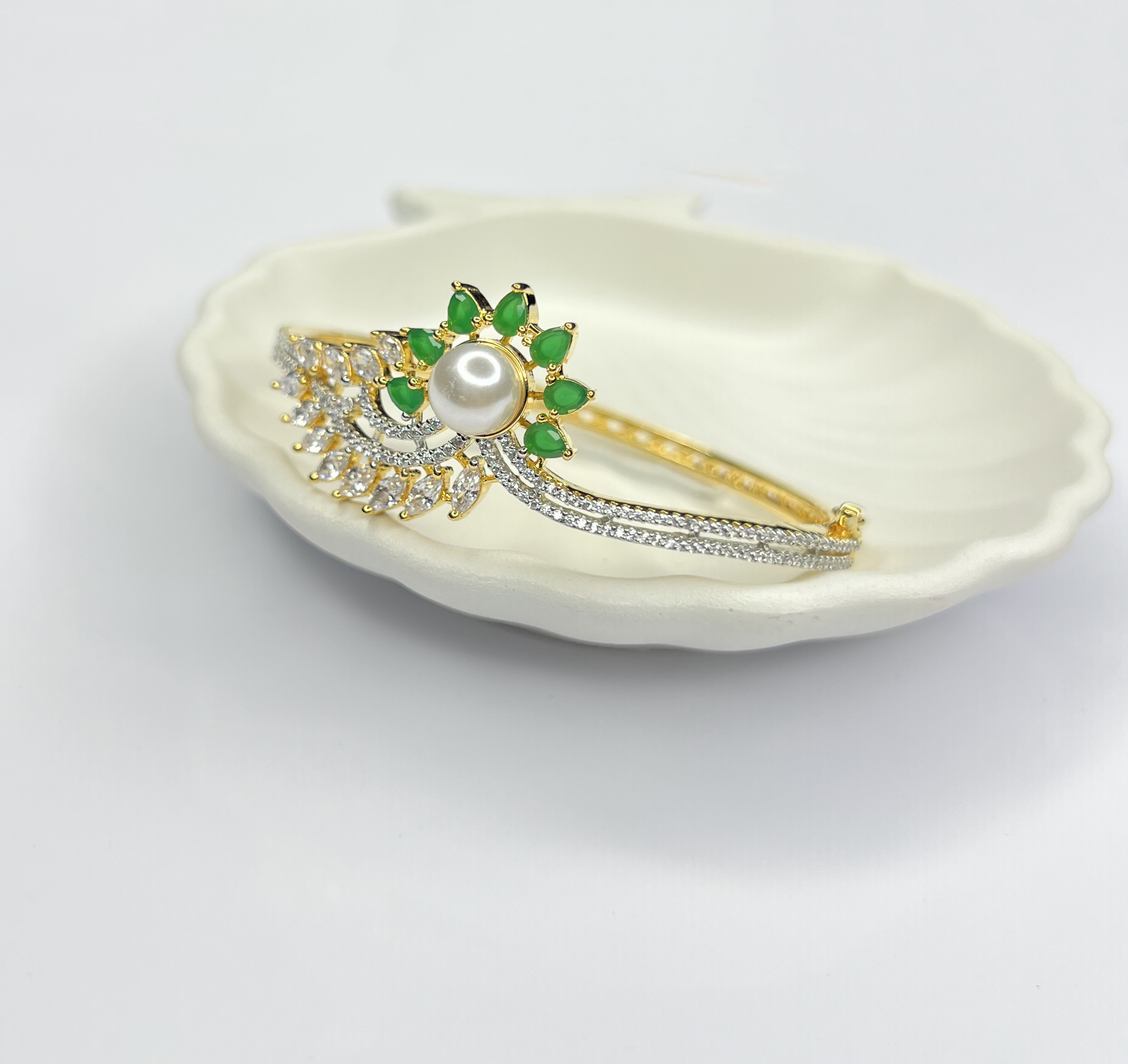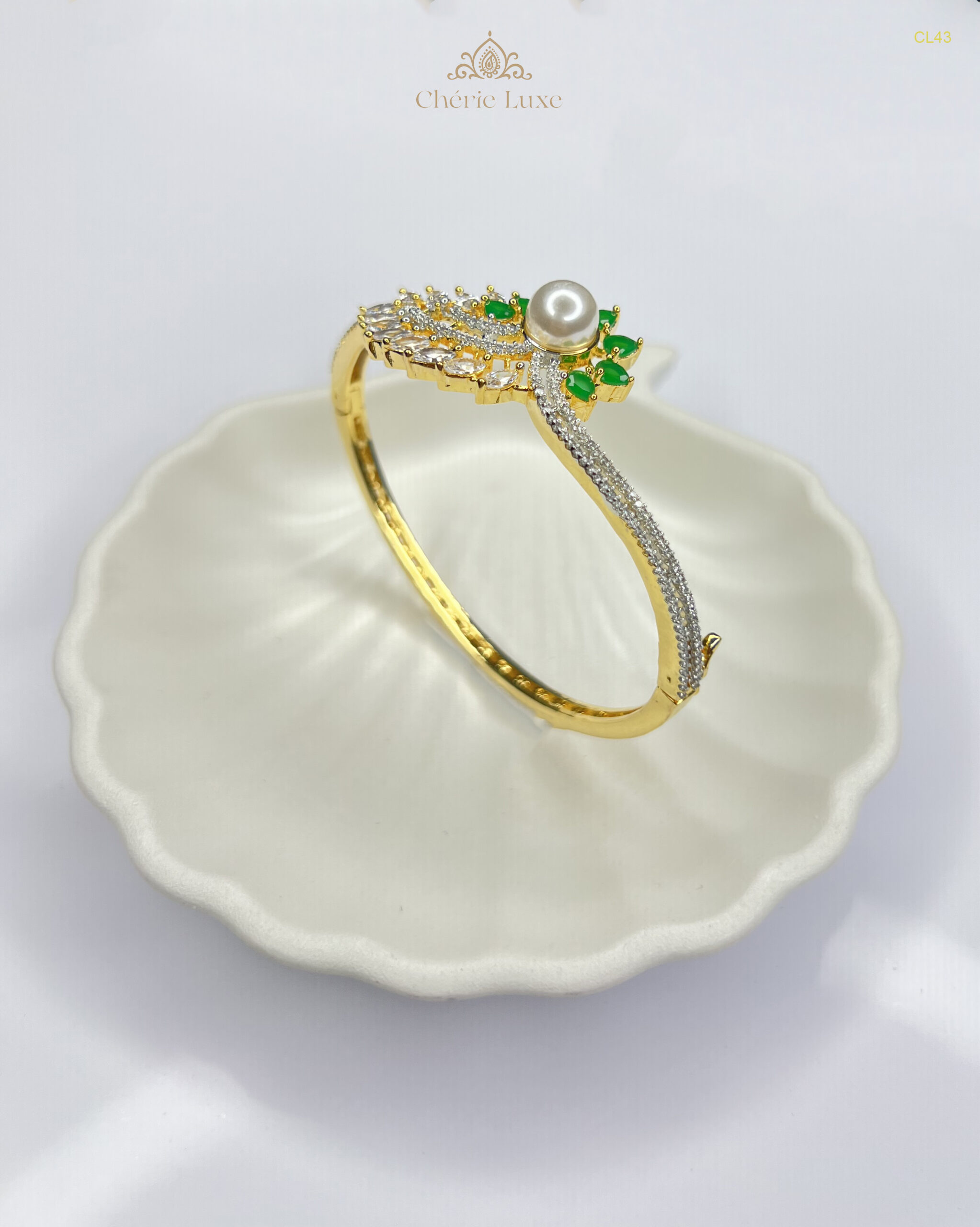 Elevate your wristwear with this exquisite gold-plated openable bracelet. Featuring a lustrous pearl centerpiece beautifully framed by vibrant emerald-green petals and a dramatic, sweeping wing of brilliant-cut clear stones. The secure hidden hinge ensures an effortless, perfect fit.