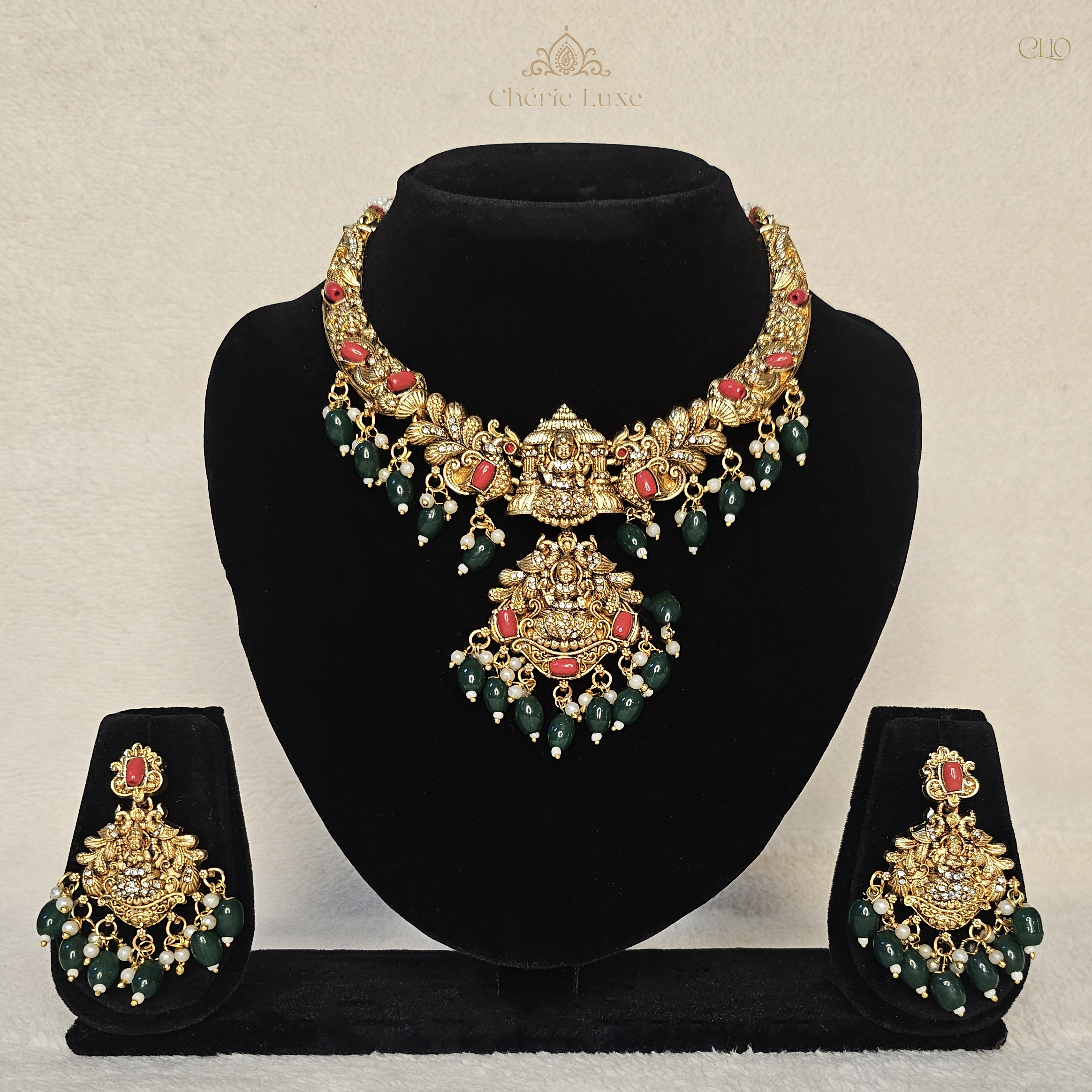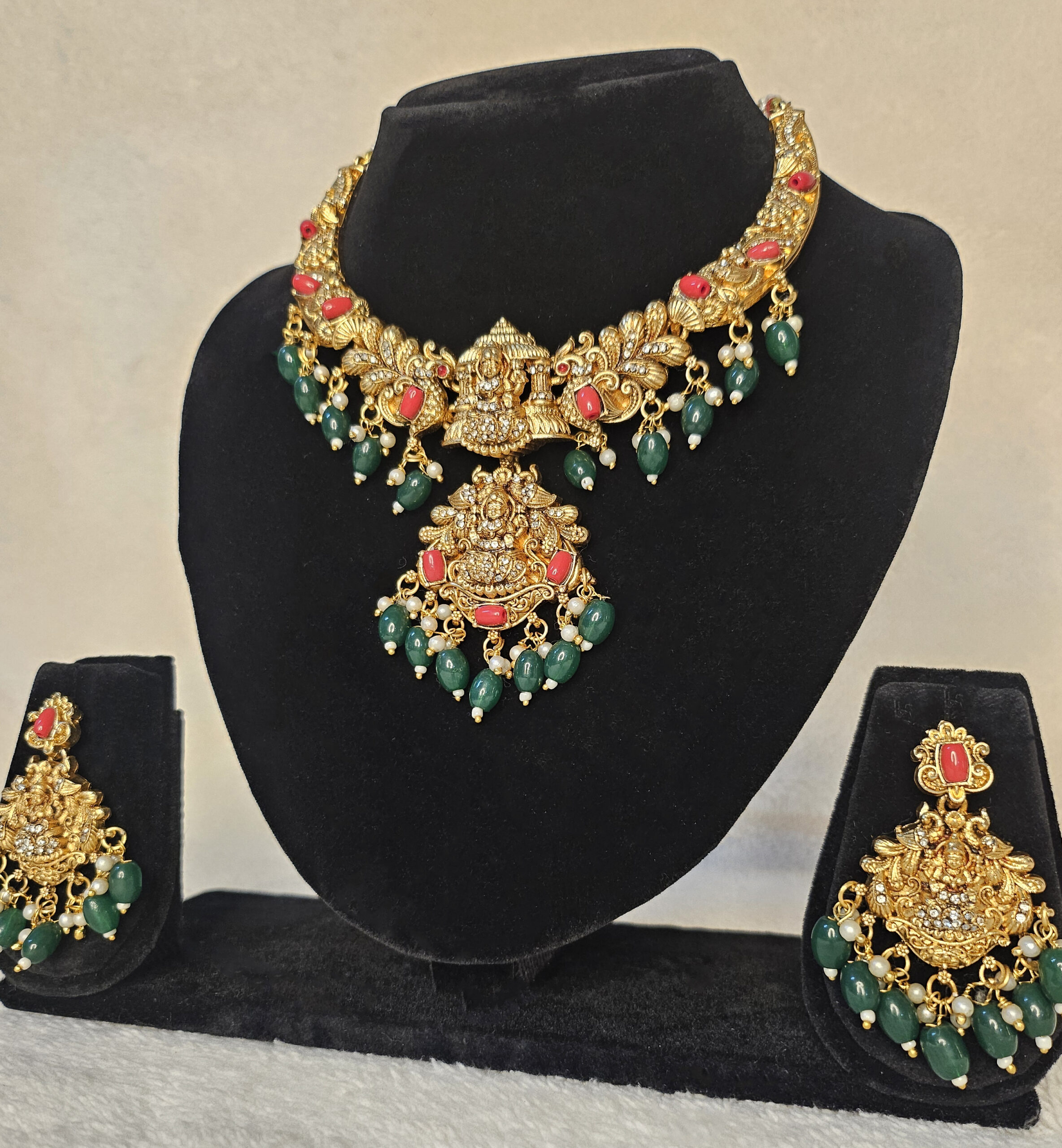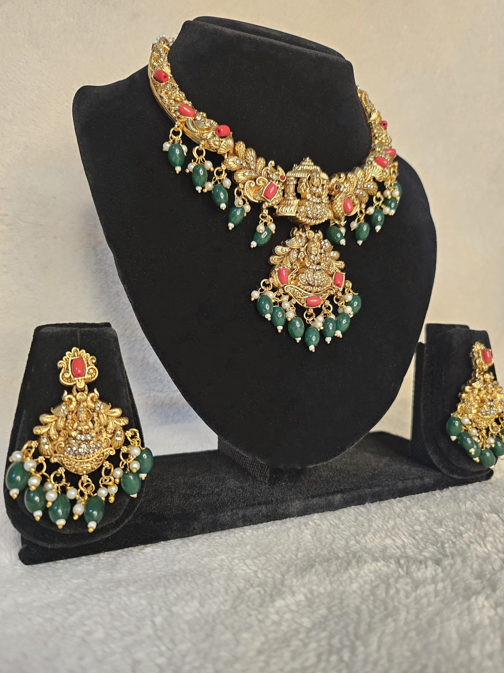 Divine Heritage Meets Regal Craftsmanship Celebrate tradition and grace with the Antique Gold-Plated Lakshmi Temple Necklace Set. Designed to replicate the heavy, luxurious look of authentic heritage imitation jewelry, this masterpiece features the divine motif of Goddess Lakshmi—a symbol of prosperity and beauty—meticulously carved into the central pendant and matching earrings.