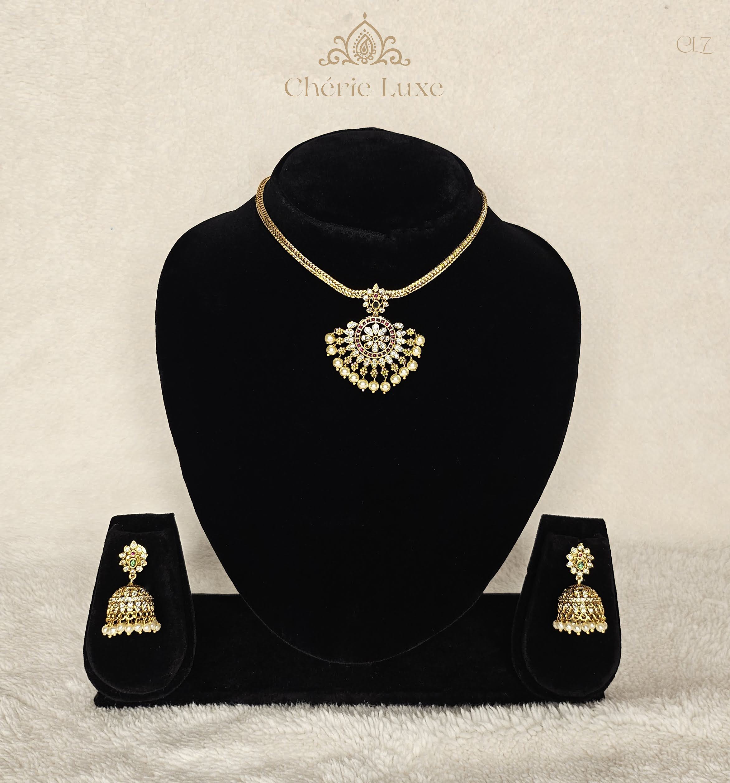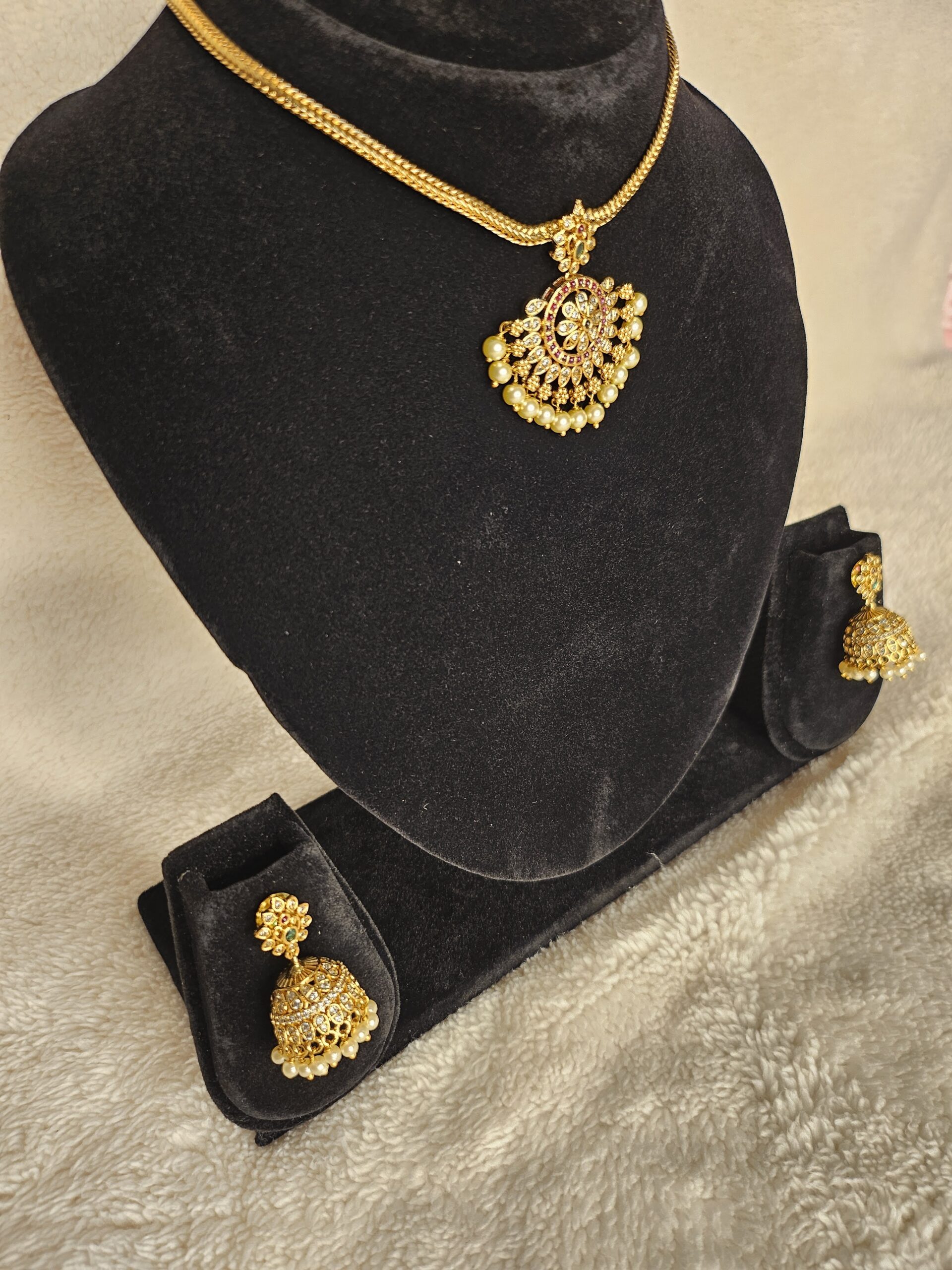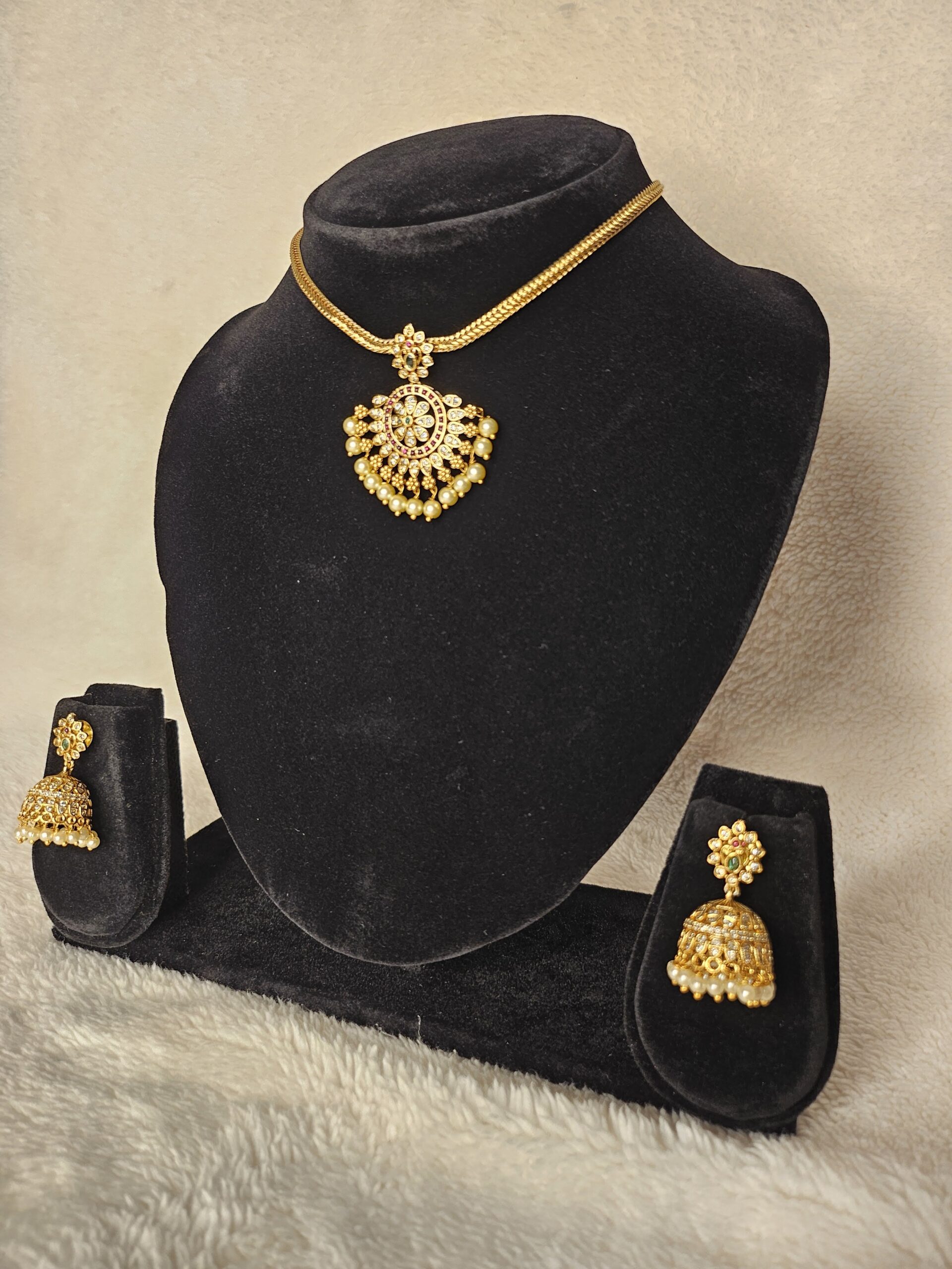 Components: 1 Necklace, 1 pair of Jhumka Earrings