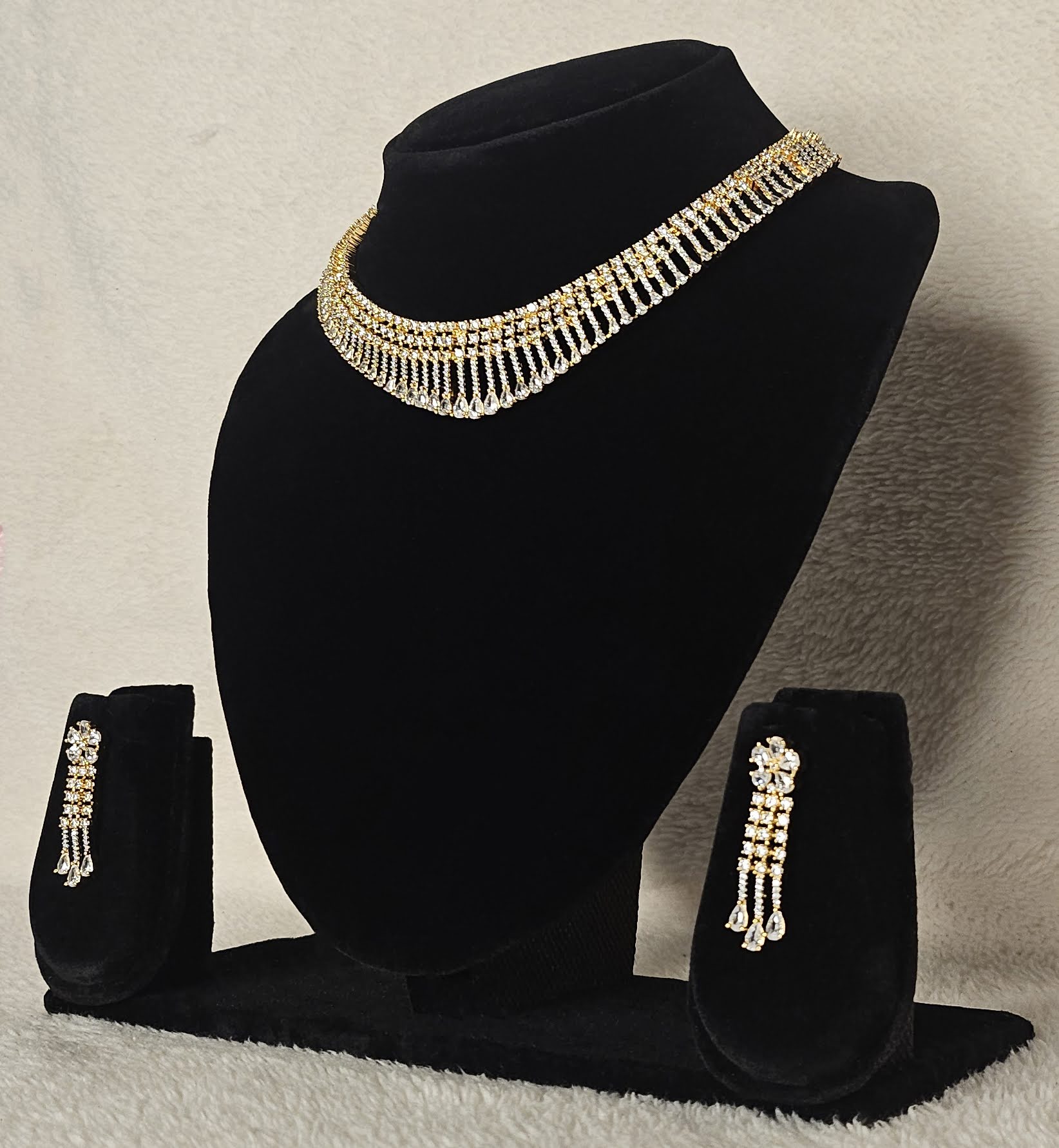 Finished in radiant gold plating and meticulously adorned with brilliant clear Cubic Zirconia, this statement necklace and earrings set adds timeless luxury and sophisticated sparkle to your bridal and evening imitation jewelry collections.