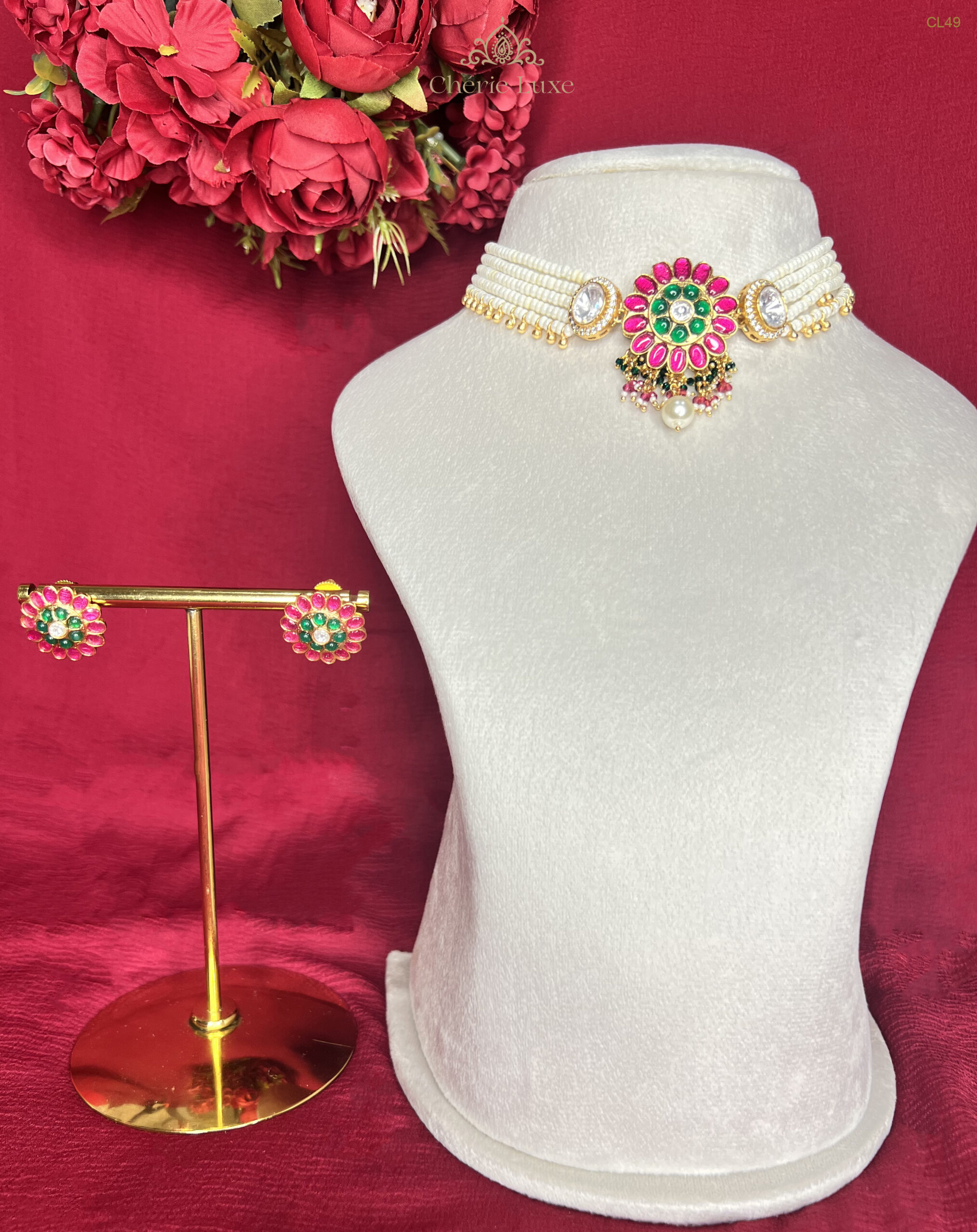 A Symphony of Pearls and Heritage Artistry The Gulnar Moti Choker Set is a tribute to timeless Indian craftsmanship, reimagined for the modern Cherie Luxe woman. The word Gulnar evokes the deep, passionate red of the pomegranate flower, mirrored in the vibrant ruby stones that form the heart of this set’s floral pendant.