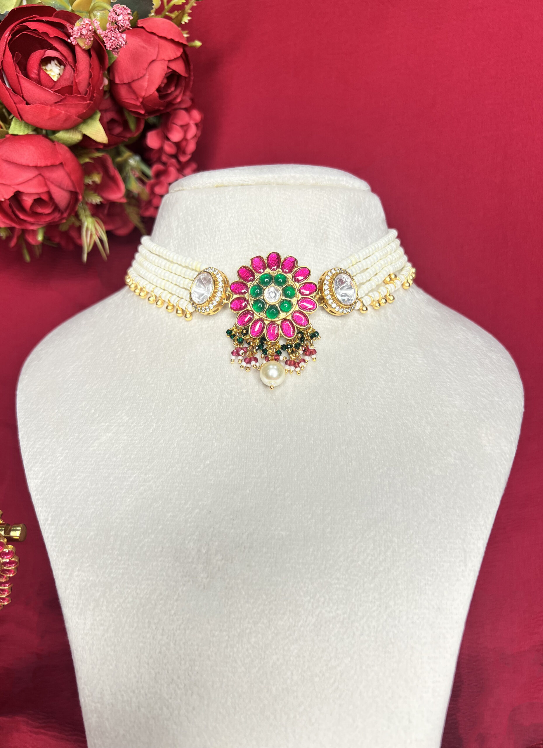 Radiate royal charm with the Gulnar Moti Choker Set. This masterpiece features five lustrous strands of high-quality faux pearls, anchored by a stunning “Gulnar” floral centerpiece. Studded with rich ruby-pink and emerald-green kemp stones and accented with sparkling polki-style crystals, this set is the ultimate accessory for weddings and festive celebrations.