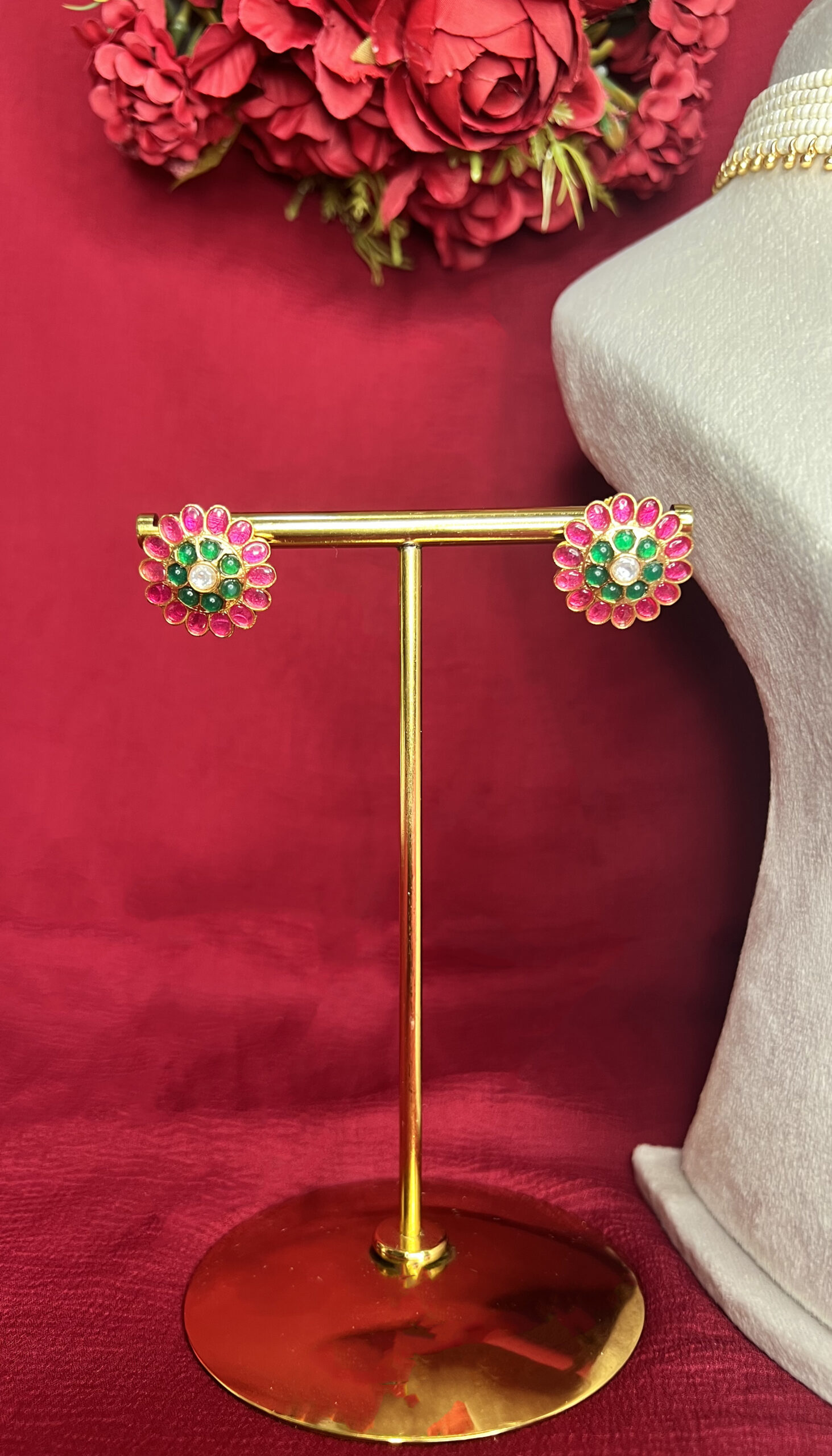 • Stone Type: High-luster Faux Pearls, Synthetic Ruby & Emerald (Kemp style), and Clear Polki-style Crystals
